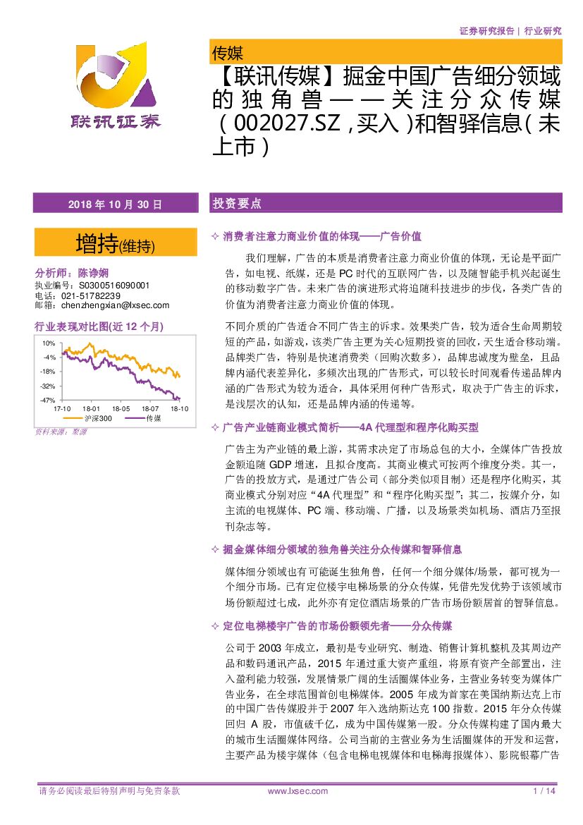 联讯证券:【联讯传媒】掘金中国广告细分领域的独角兽——关注分众传媒(002027.SZ,买入)和智驿信息(未上市).pdf