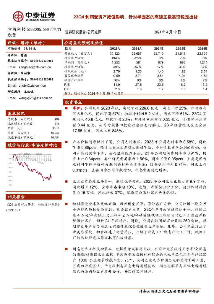 中泰证券:容百科技(688005)-23Q4利润受资产减值影响,针对半固态的高镍正极实现稳定出货.pdf