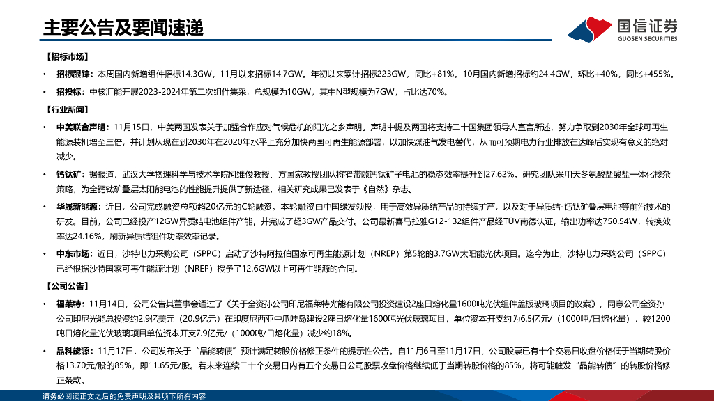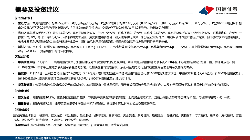 国信证券:光伏产业链周评(11月第3周):中美阳光之乡声明提振信心,钙钛矿板块交易活跃.pdf