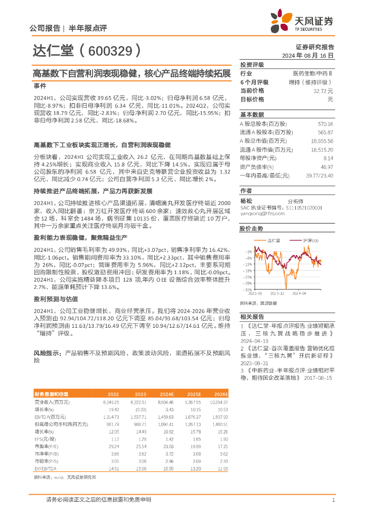 天风证券:达仁堂(600329)-高基数下自营利润表现稳健,核心产品终端持续拓展.pdf