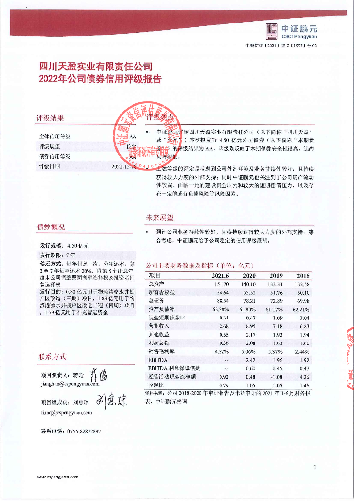 鹏元:2022年四川天盈实业有限责任公司公司债券信用评级报告.pdf