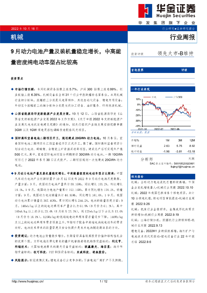 华金证券:机械行业周报:9月动力电池产量及装机量稳定增长,中高能量密度纯电动车型占比较高.pdf