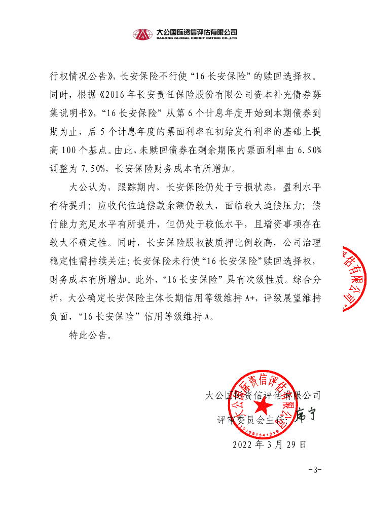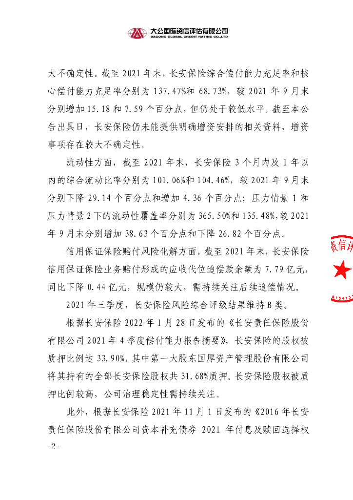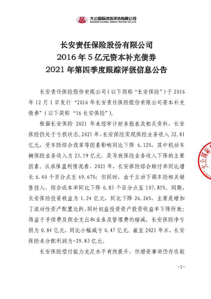 大公:长安责任保险股份有限公司2016年5亿元资本补充债券2021年第四季度跟踪评级信息公告.pdf