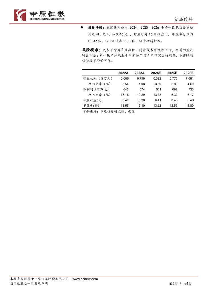 中原证券:桃李面包(603866)-2024年中报点评,二季度盈利修复,销售仍然承压.pdf