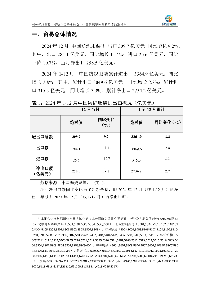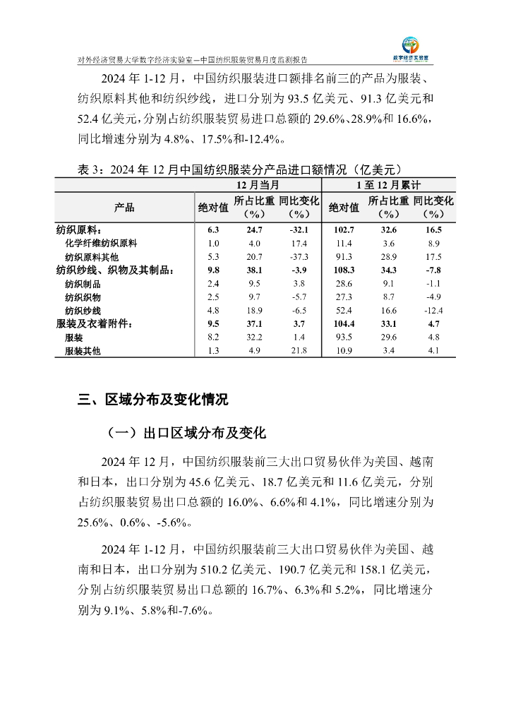 对外经济贸易大学:中国纺织服装贸易月度监测报告(2024年1-12月).pdf