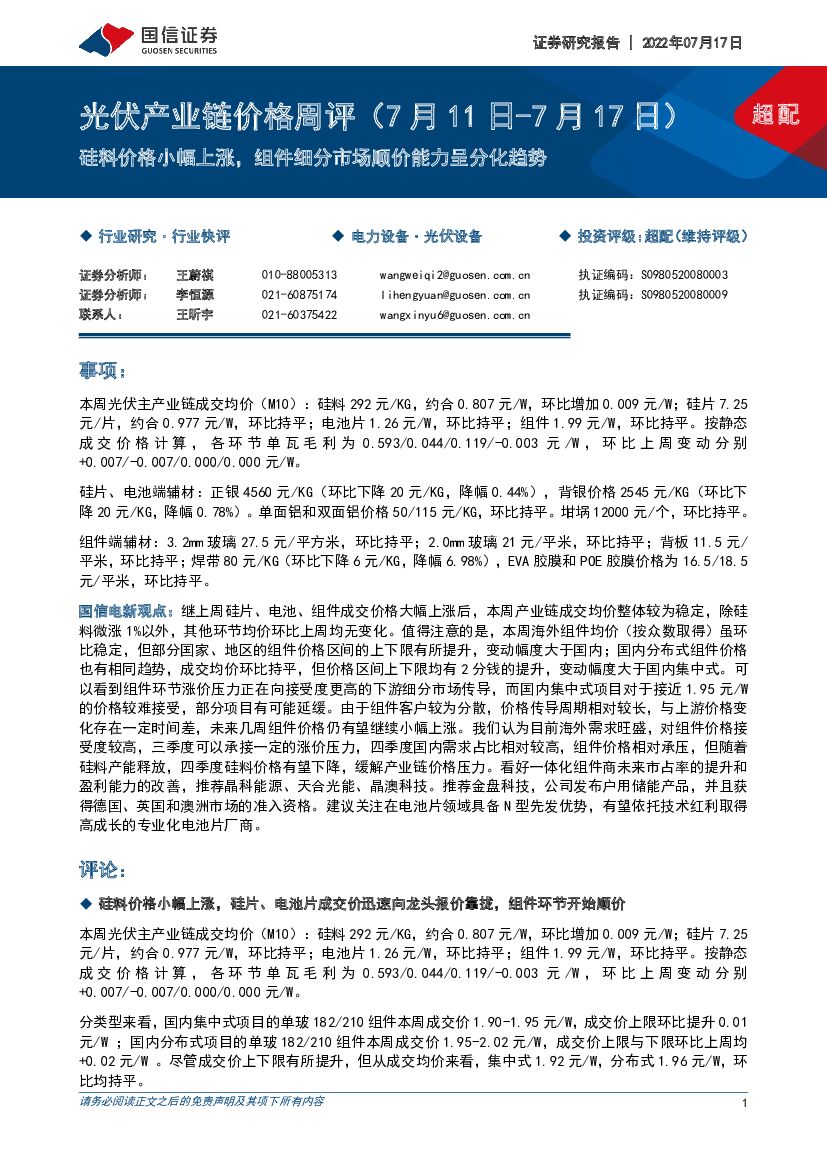 国信证券:光伏产业链价格周评:硅料价格小幅上涨,组件细分市场顺价能力呈分化趋势.pdf