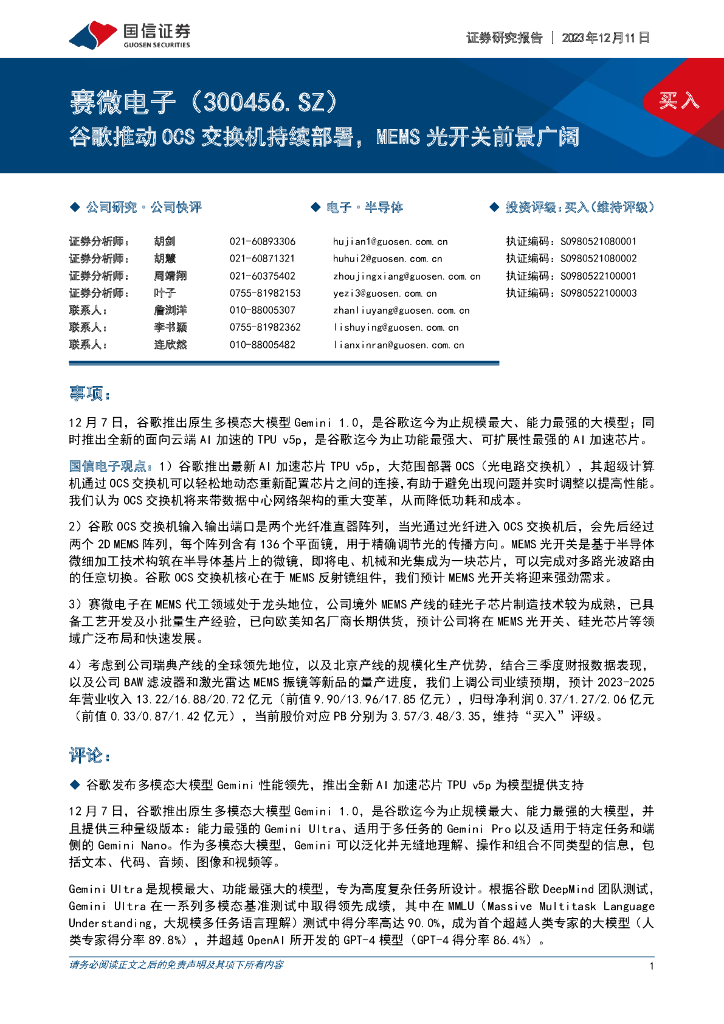 国信证券:赛微电子(300456)-谷歌推动OCS交换机持续部署,MEMS光开关前景广阔.pdf