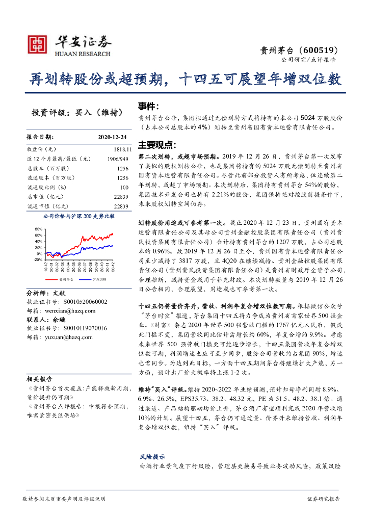华安证券:贵州茅台(600519)-再划转股份或超预期,十四五可展望年增双位数.pdf