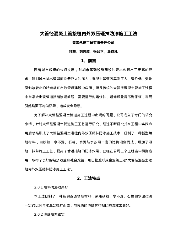 QHGF-2022013 大管径混凝土管接缝内外双压砸抹防渗施工工法.doc