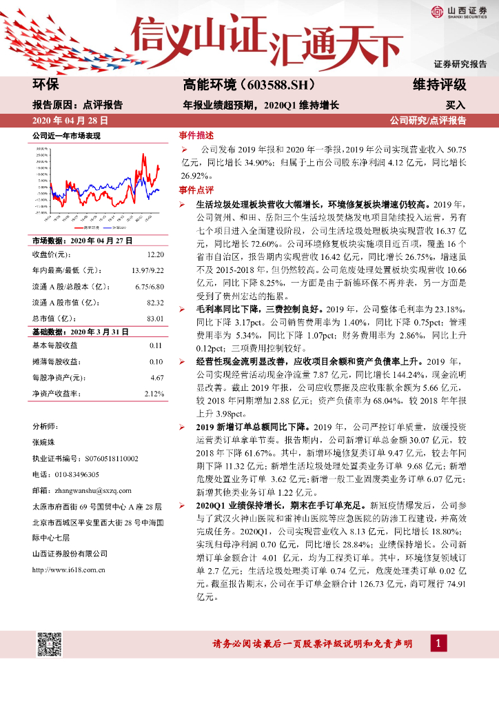 山西证券:高能环境(603588)-年报业绩超预期,2020Q1维持增长.pdf