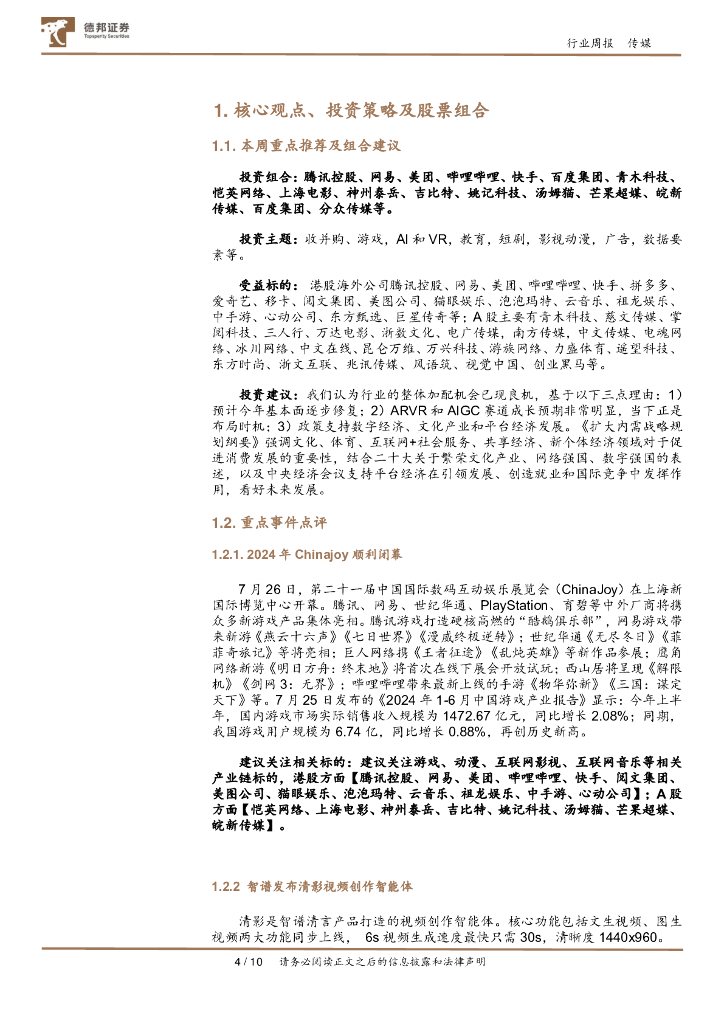 德邦证券:传媒互联网行业周报:2024年Chinajoy顺利闭幕,智谱发布清影视频创作智能体.pdf
