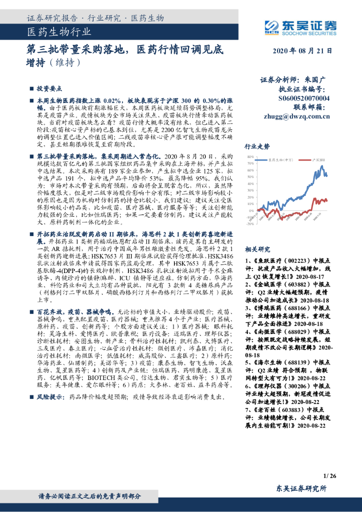 东吴证券:医药生物行业:第三批带量采购落地,医药行情回调见底.pdf
