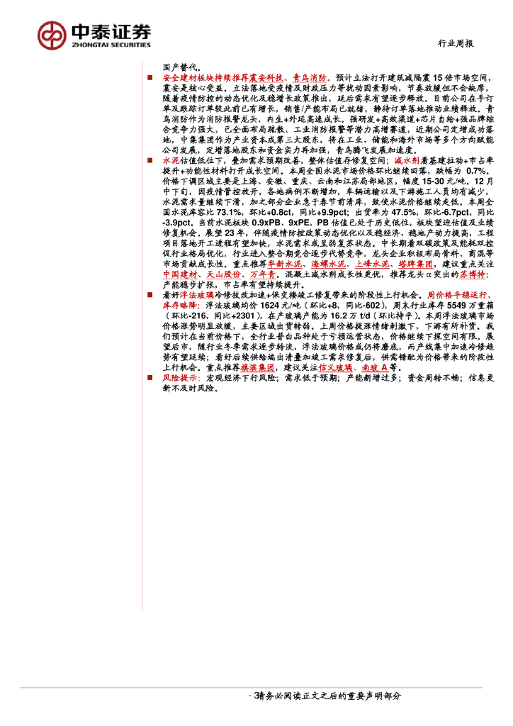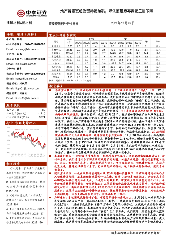 中泰证券:建筑材料&新材料行业周报:地产融资宽松政策持续加码;浮法玻璃库存连续三周下降.pdf