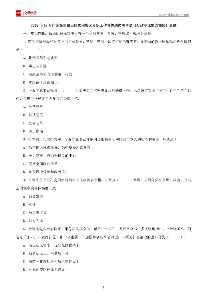 2018年12月广东深圳福田区选用社区专职工作者辅助岗类考试《行政职业能力测验》 ...pdf