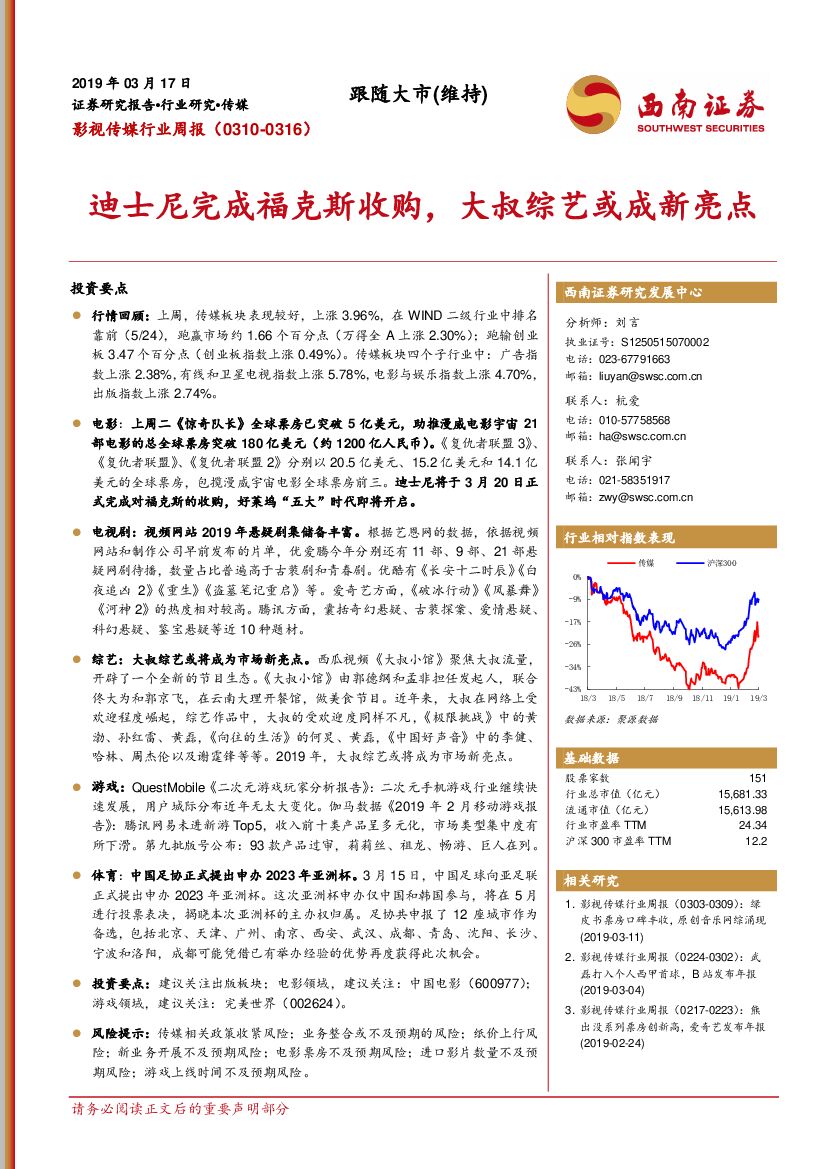 西南证券:影视传媒行业周报:迪士尼完成福克斯收购,大叔综艺或成新亮点.pdf
