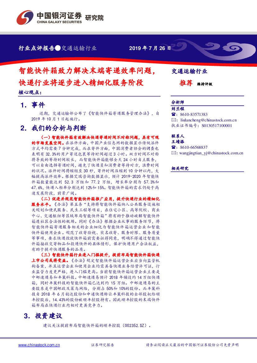 中国银河:交通运输行业点评报告:智能快件箱致力解决末端寄递效率问题,快递行业将逐步进入精细化服务阶段.pdf