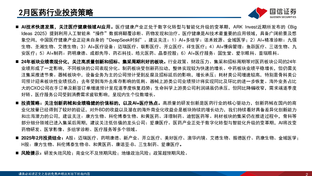 国信证券:医药生物行业2025年2月投资策略:关注AI+医疗、高质量创新和业绩稳健的价值标的.pdf