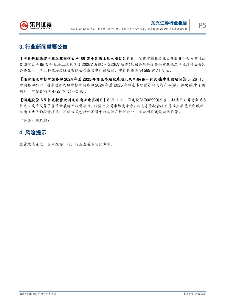 东兴证券:传媒互联网&通信行业:中天科技海缆中标江苏国信大丰风电项目,润建股份拟投资欧洲及东南亚项目.pdf