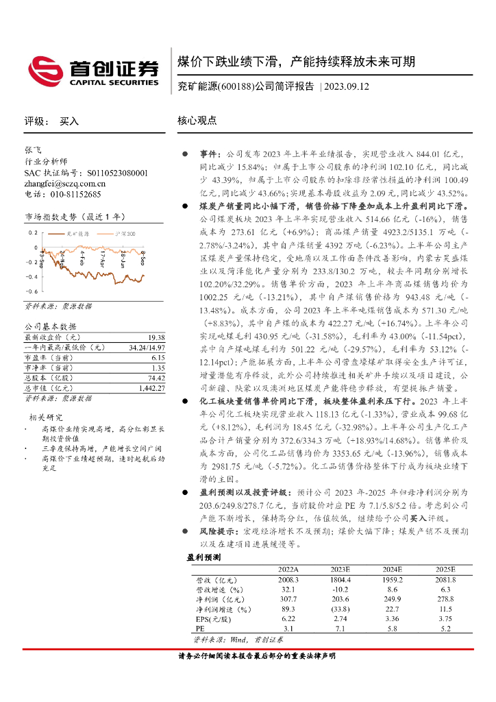 首创证券:兖矿能源(600188)-公司简评报告:煤价下跌业绩下滑,产能持续释放未来可期.pdf