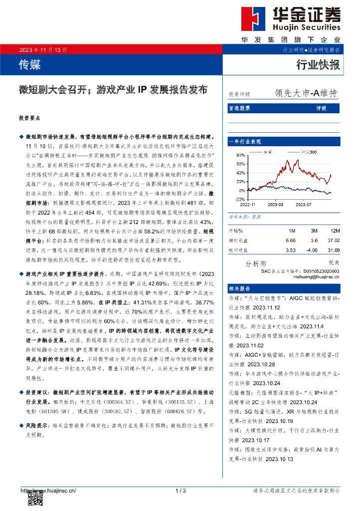 华金证券:传媒:微短剧大会召开;游戏产业IP发展报告发布.pdf