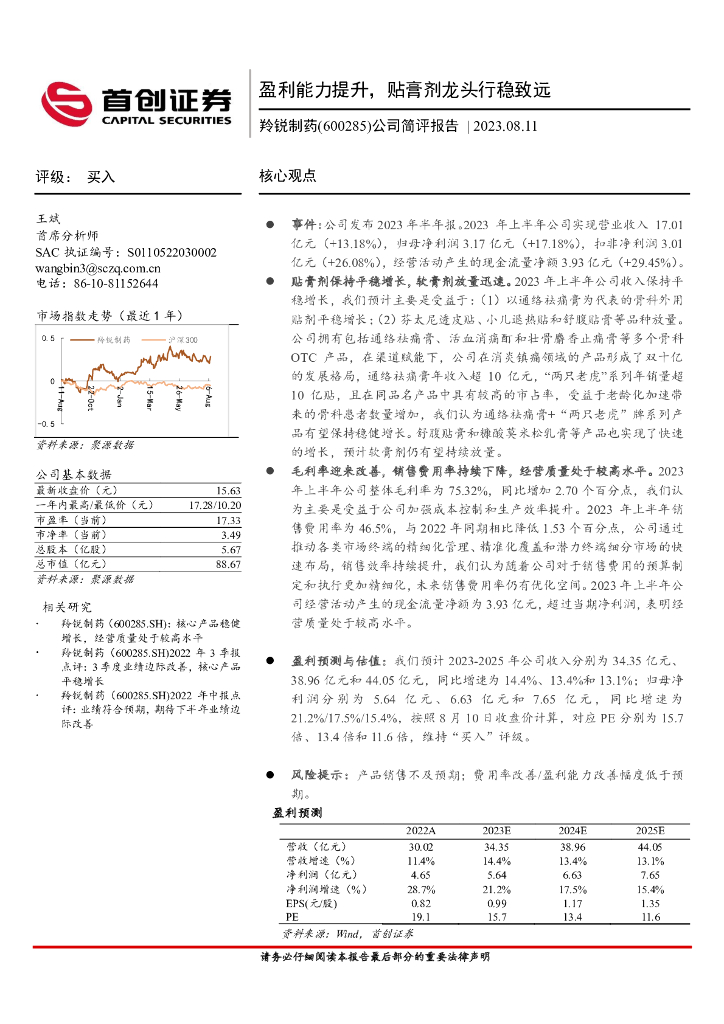首创证券:羚锐制药(600285)-公司简评报告:盈利能力提升,贴膏剂龙头行稳致远.pdf