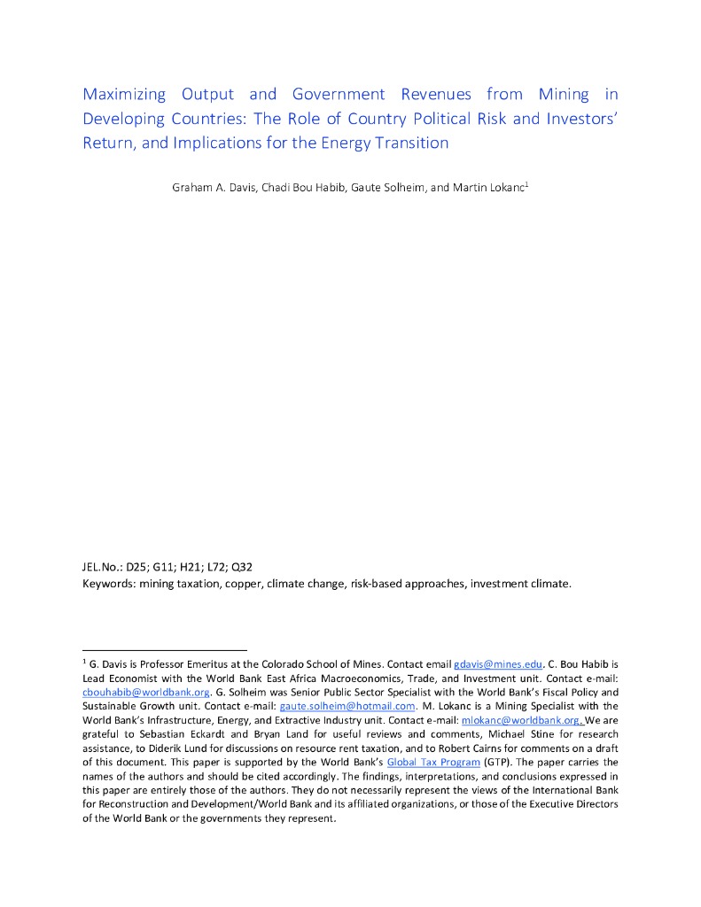 世界银行:发展中国家矿业产出和政府收入最大化:国家政治风险和投资者回报的作用及其对能源转型的影响报告(英文版).pdf
