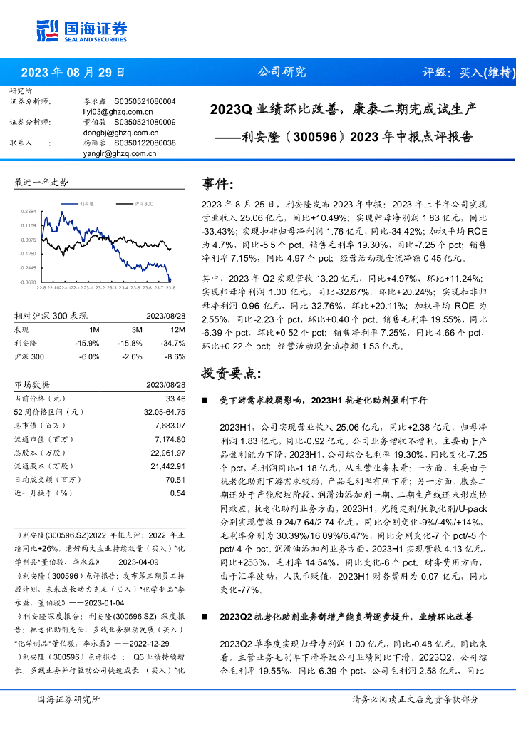 国海证券:利安隆(300596)-2023年中报点评报告:2023Q业绩环比改善,康泰二期完成试生产.pdf