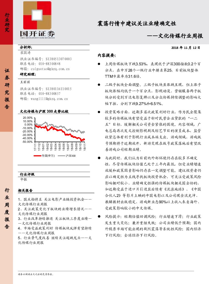 国开证券:文化传媒行业周度报告:震荡行情中建议关注业绩确定性.pdf