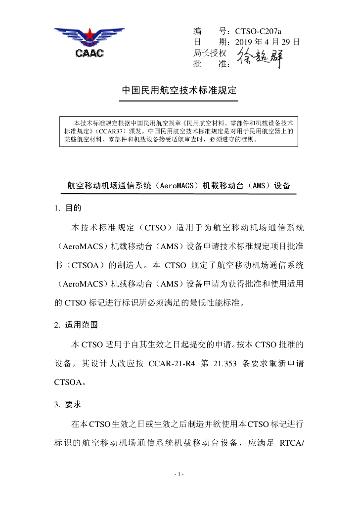 CTSO-C207a《航空移动机场通信系统(AeroMACS)机载移动台(AMS)设备》.pdf