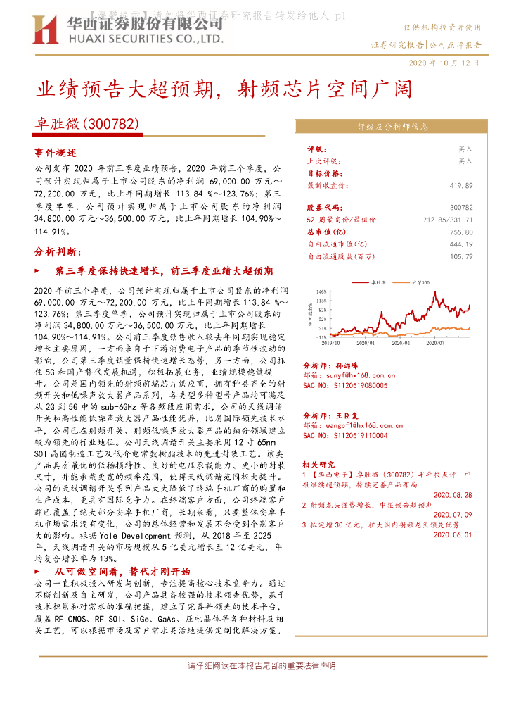 华西证券:卓胜微(300782)-业绩预告大超预期,射频芯片空间广阔.pdf