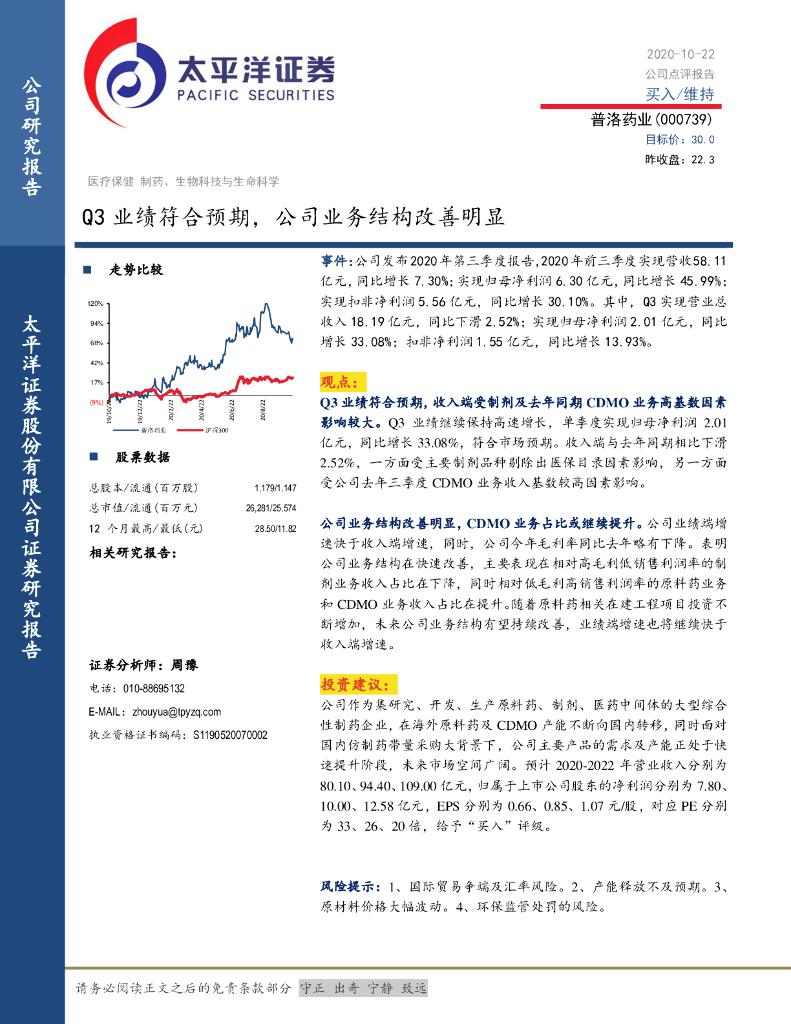 太平洋证券:普洛药业(000739)-Q3业绩符合预期,公司业务结构改善明显.pdf