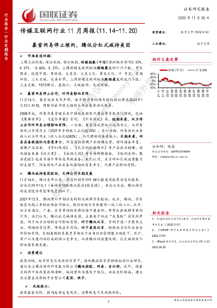 国联证券:传媒互联网行业11月周报:暴雪网易停止续约,腾讯分红式减持美团.pdf