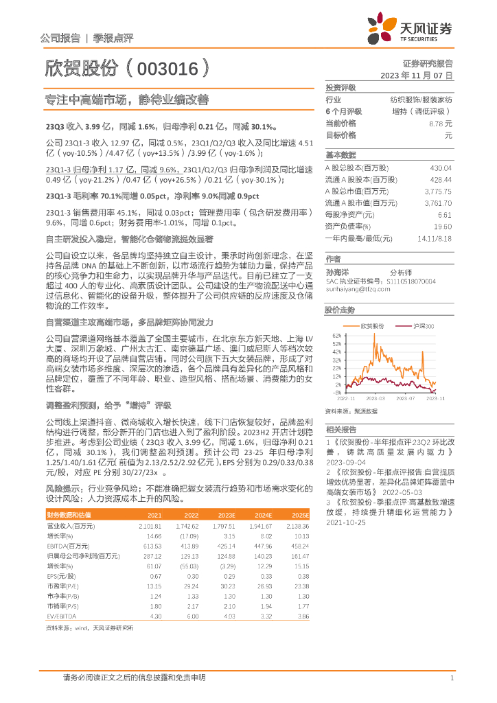 天风证券:欣贺股份(003016)-专注中高端市场,静待业绩改善.pdf