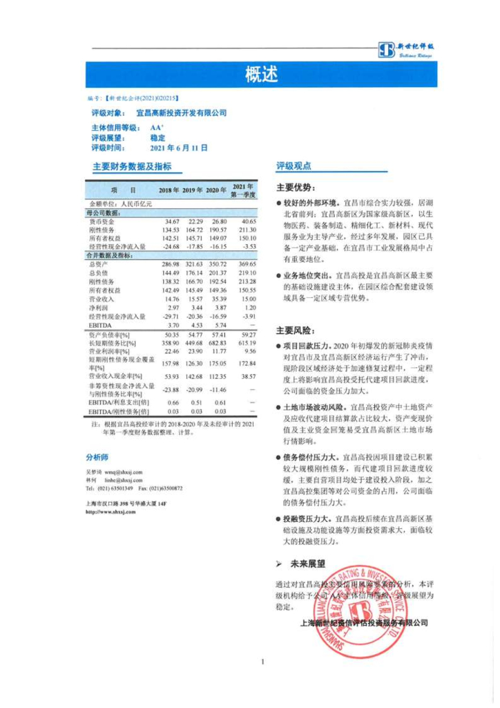 新世纪:宜昌高新投资开发有限公司2021年主体信用评级报告及跟踪评级安排.pdf