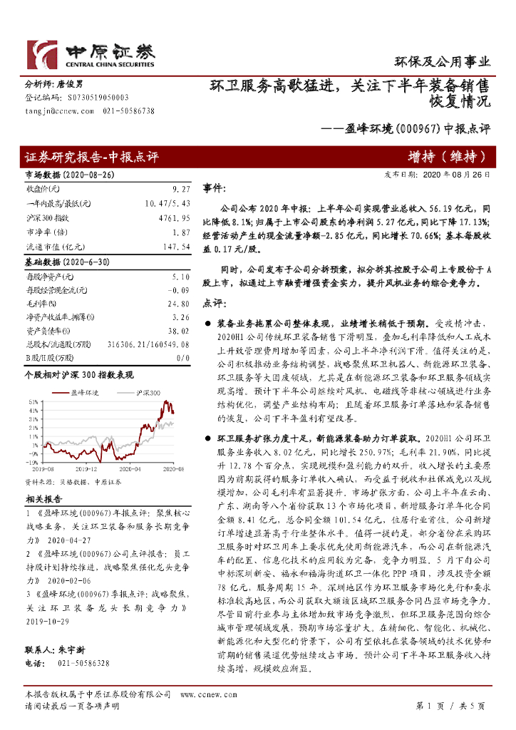 中原证券:盈峰环境(000967)-中报点评:环卫服务高歌猛进,关注下半年装备销售恢复情况.pdf