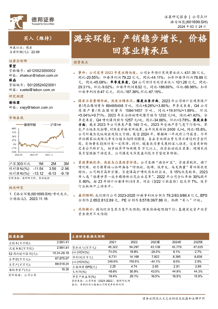 德邦证券:潞安环能(601699)-产销稳步增长,价格回落业绩承压.pdf