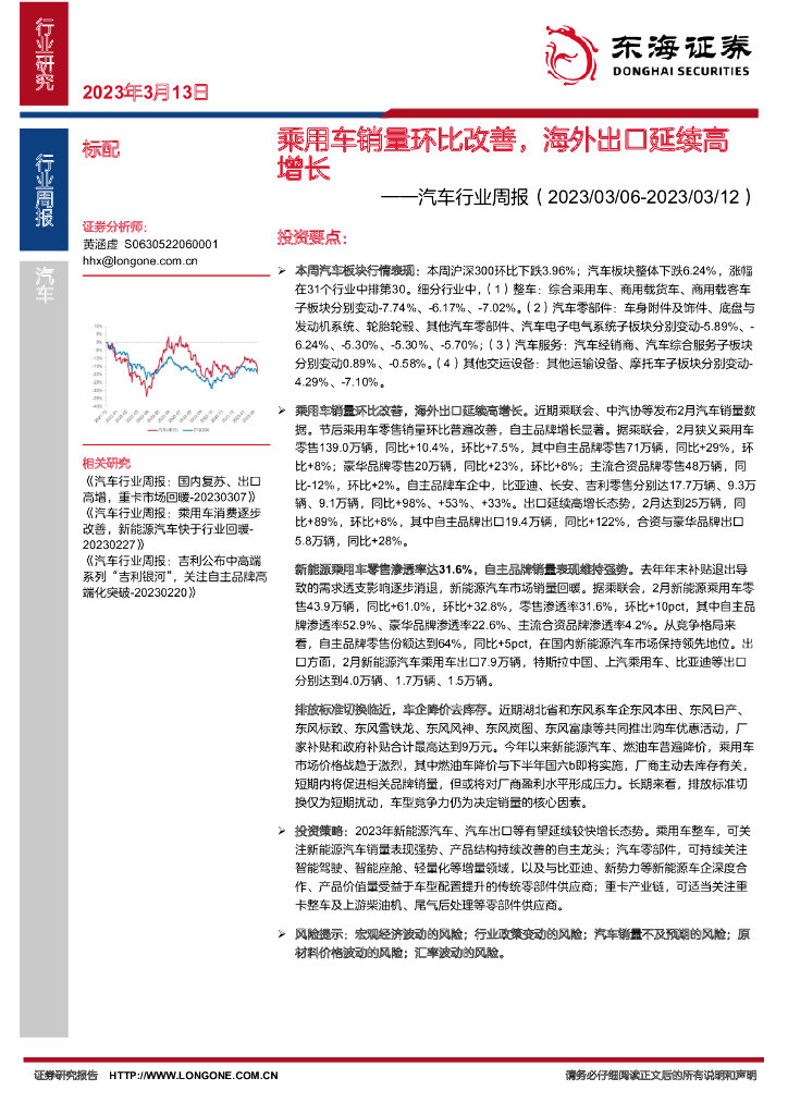 东海证券:汽车行业周报:乘用车销量环比改善,海外出口延续高增长.pdf