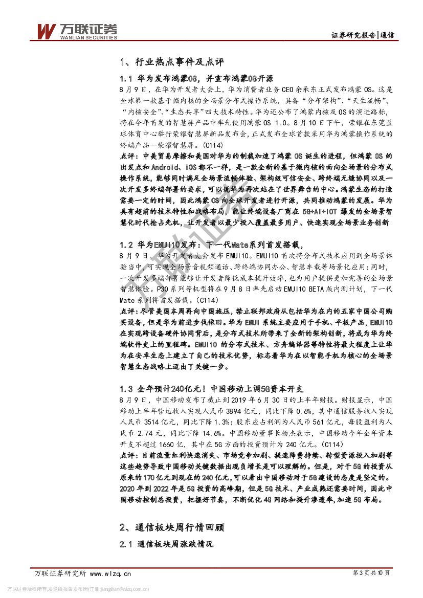 万联证券:通信行业周观点:华为开发者大会首发鸿蒙OS和EMUI10.pdf