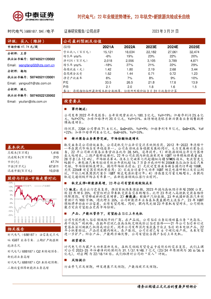 中泰证券:时代电气:22年业绩逆势增长,23年轨交+新能源共绘成长曲线.pdf