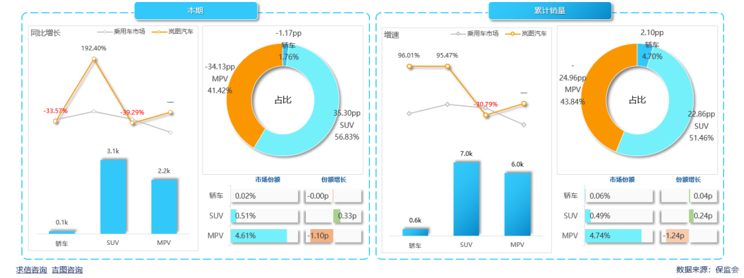 上年同期扩大0.33pp。累计销量6994辆,占比和市场份额同步扩大,增速超过大市场,岚图汽车SUV占主导地位,本期销量3076辆,同比增长192.40%;销售占比56.83%,占比较上年同期扩大35.30pp。SUV市场份额0.51%。