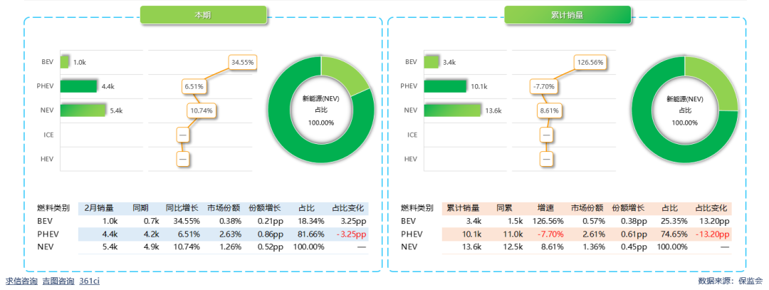 新能源累计市场份额1.36%,较上年同期扩大0.45pp。其中BEV销量3446辆,增长126.56%,市场份额0.57%,较上年同期扩大0.38pp,销售占比18.34%;PHEV销量10146辆,下滑7.70%,市场份额2.61%,较上年扩大0.61pp,销售占比81.66%。