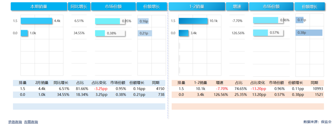 累计销量方面,1.5排量市场表现好于大市场,销量10146辆,同比下滑7.70%;占比100.00%,高于大市场;市场份额0.96%,份额较上年扩大0.11Pp。0.0排量车型销量3446辆,同比增长126.56%;占比高于大市场;市场份额0.57%,份额较上年扩大0.38pp。