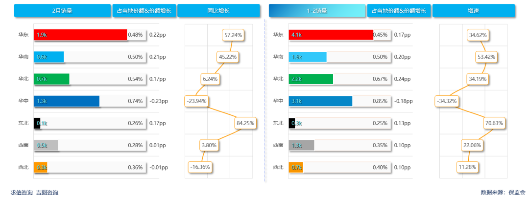 累计销量方面,东北地区拉动增长,累计销量331辆,较上年增长70.63%,销量贡献2.44%,当地市场份额0.25%,较上年扩大0.13pp。华东地区作为销量担当起到带头作用,累计销量4118辆,较上年增长34.62%,销量贡献30.30%,当地市场份额0.25%,较上年扩大0.13pp。