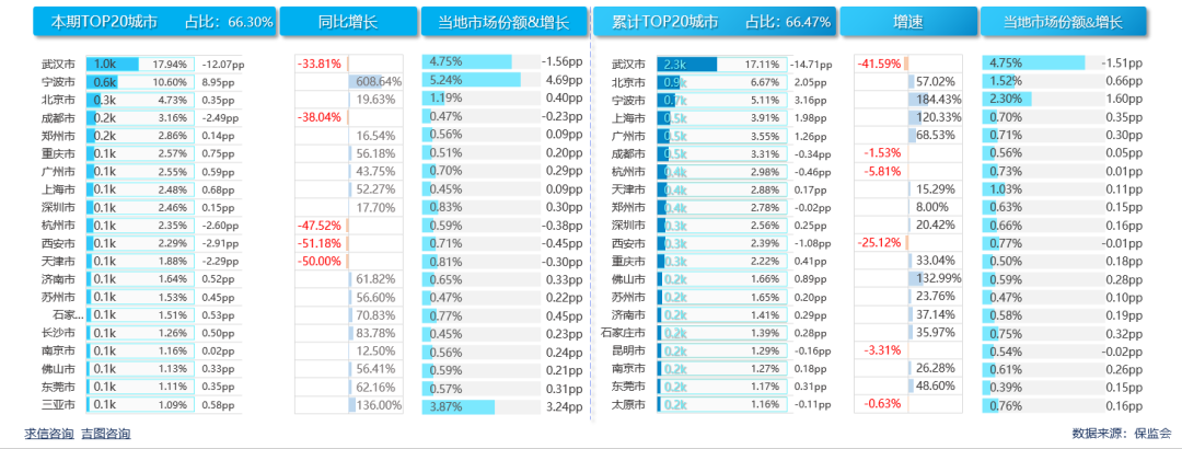 本期销量前20城市贡献66.30%,销量相对集中,市场仍有开拓空间。武汉市销量一枝独秀,本期完成971辆,同比下滑33.81%;销量占比17.94%,比重较上年同期缩小12.07pp,当地市场份额4.75%,较上年缩小1.56pp。宁波市增长最快,本期销量574辆,排第2,同比增长608.64%;销量占比10.60%,占当地市场份额5.24%。