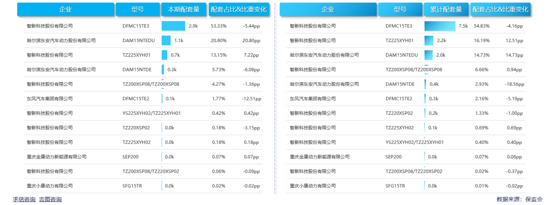 全部在售车型共配套12款发动机,智新科技股份有限公司的DFMC15TE3型号发动机比重最高,累计配套量7452辆,占比54.83%,较上年缩小4.16pp。智新科技股份有限公司的TZ225XYH01型号发动机配套量2200辆,占比16.19%,较上年扩大12.51pp。