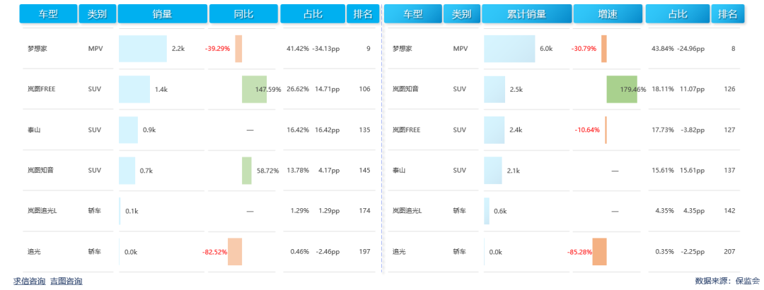 本明共有6款车型产生销量,有2款实现正增长。梦想家以2242辆的成绩成为销量当担,同比下滑39.29%,销售占比41.42%,较上年同期缩小34.13pp,MPV细分市场排名第9位。岚图FREE销量1441辆,同比增长147.59%,销售占比26.62%,较上年同期扩大14.71pp,SUV细分市场排名106位。