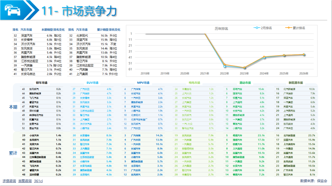 累计销量保持增长态势,销量完成13592辆,增长8.61%;市场份额0.51%,较上年同期扩大0.11pp;市场排名第36,较上年同期上升1位。与近5年累计销量相比销量创历史新高;市场排名历年最高;增速有3期超越大市场,1期落后。