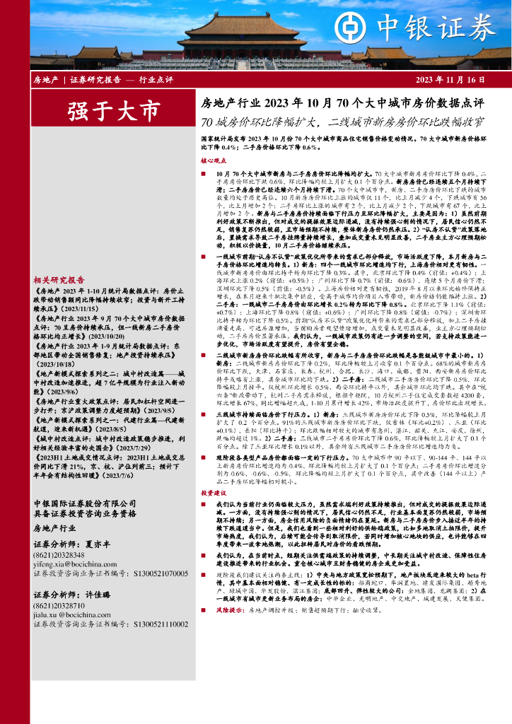 中银证券:房地产行业2023年10月70个大中城市房价数据点评:70城房价环比降幅扩大,二线城市新房房价环比跌幅收窄.pdf