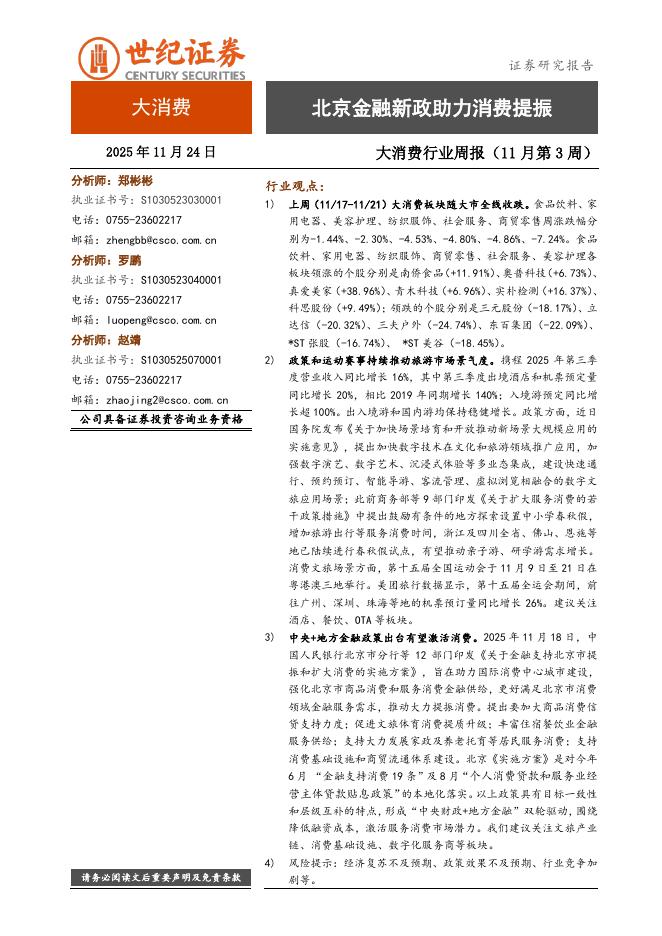 世纪证券:大消费行业周报(11月第3周):北京金融新政助力消费提振.pdf