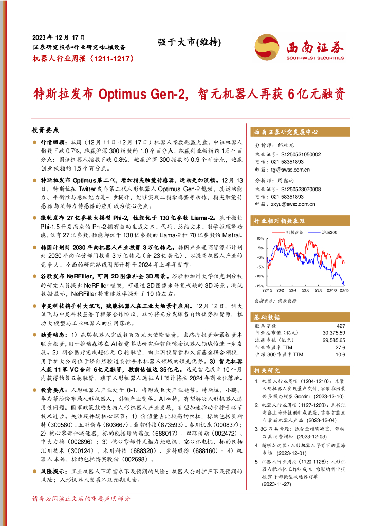 西南证券:机器人行业周报:特斯拉发布Optimus Gen-2,智元机器人再获6亿元融资.pdf